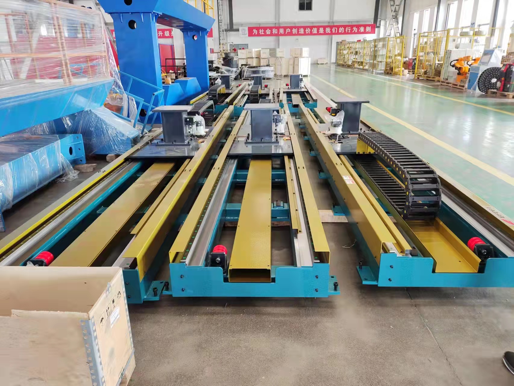 行走軌道可以配合國產機器人,也可以配進口機器人使用。如果咱們想要軌道跟機器人做直接聯動,也就是機器人在行走軌道上面邊走邊工作,那行走軌道里面裝的電機,是需要跟機器人同品牌同型號的,所以一般這個第七軸電機是需要跟機器人配套的,可以在購買機器人的時候跟機器人廠家來配。